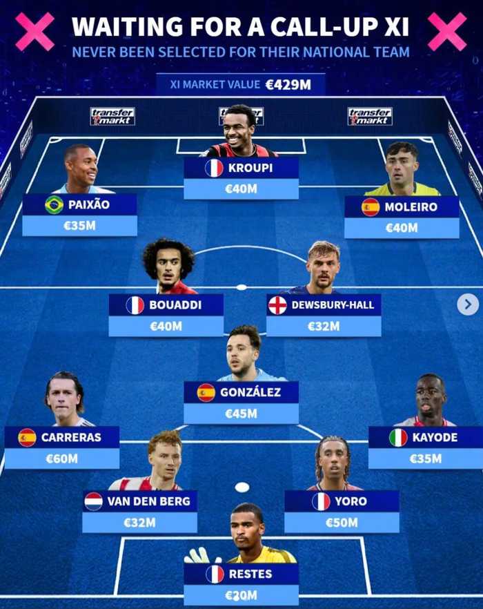 德转统计了从未入选国家队身价最高的阵容,皇马的A费以6000万领衔4.29亿阵容。